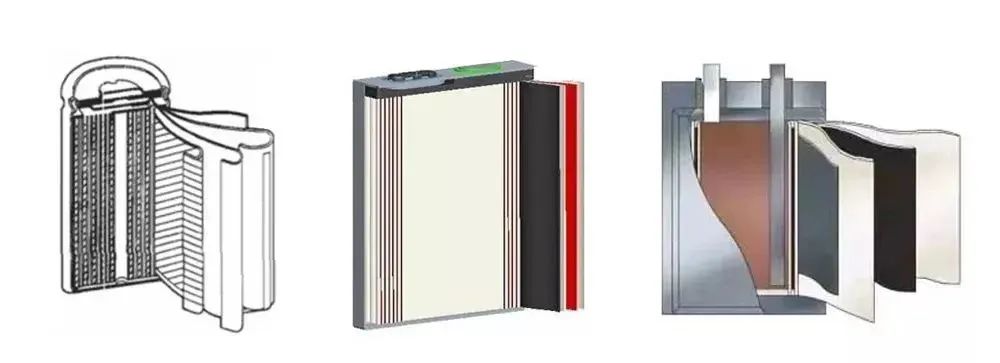 左-圆形聚合物锂锂电芯 中-方壳聚合物锂锂电芯 右-硬包聚合物锂锂电芯